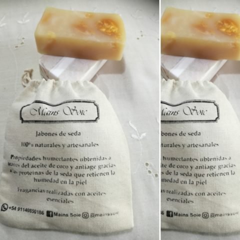 JABONES con CAPULLOS DE SEDA NATURAL: Mains Soie es un producto único y exclusivo, está realizado con capullos de seda natural, aceite de coco y aceites esenciales que le dan un aroma único e inconfundible. La seda natural contiene dos proteínas, SERECINA Y FIBROINA, cuyos aminoácidos son los encargados de retener agua en la piel. El aceite de coco es un emoliente por excelencia y muy limpiador, además de ser bactericida, ambos productos dan como resultado una piel humectada e hidratada, favoreciendo la renovación de las células muertas a través de los capullos que pueden apreciarse en el jabón, dando lugar a una mayor penetración de sus proteínas, otorgando brillo y produciendo un factor anti edad. Su uso está recomendado para el rostro y el cuerpo.